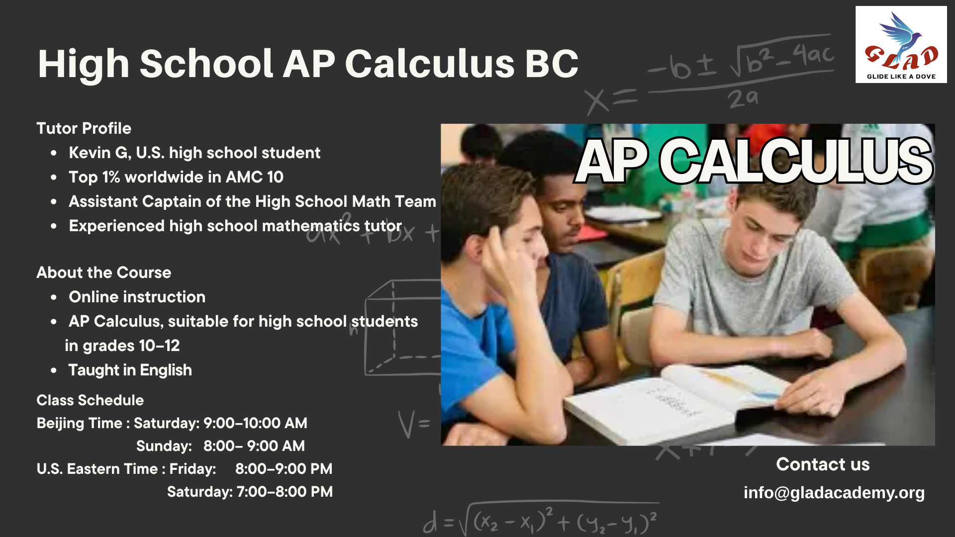 This course prepares high school students for Calculus by strengthening algebraic, geometric, and trigonometric foundations. Students will explore functions, equations, and advanced concepts while developing critical thinking and problem-solving skills. By the end, they will be confident and ready to succeed in AP Calculus or university-level mathematics.